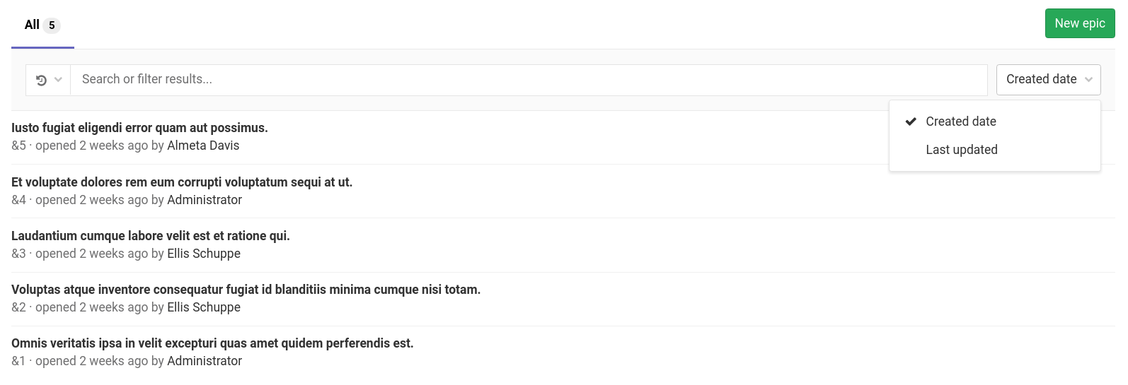 To search, go to the list of epics and click on the field Search or filter results.... It will display a dropdown menu, from which you can add an author. You can also enter plain text to search by epic title or description. When done, press Enter on your keyboard to filter the list.