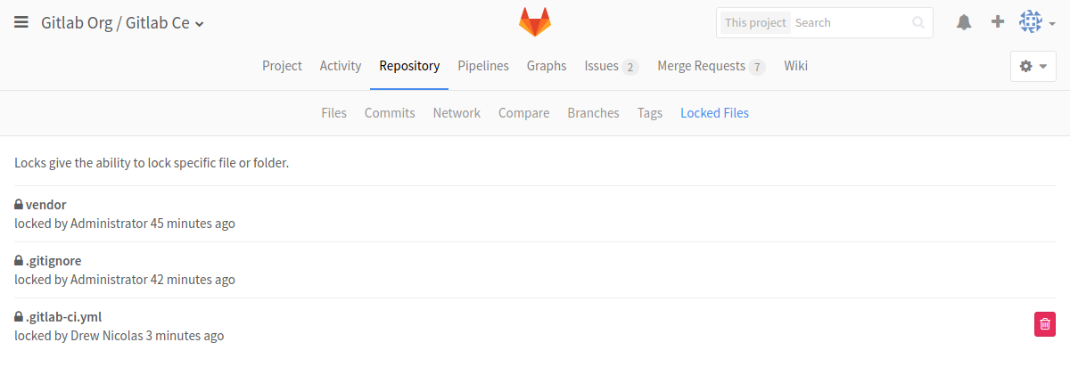 Note: Locking only works for the default branch you have set in the project's settings (usually