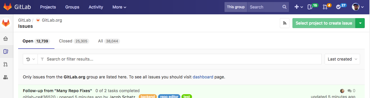Head to the Group dashboard and click "Issues" in the sidebar to visit the Issue Tracker for all projects in your Group. Select the project you'd like to add an issue for using the dropdown button at the top-right of the page.